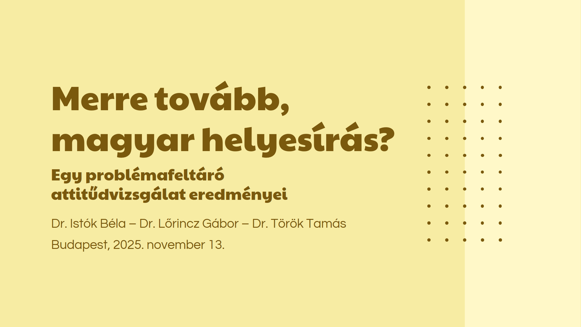 2025. november 13-án tanszékünk oktatói részt vettek a Magyarságkutató Intézet Magyar helyesírás: fejlesztés és hagyomány c. konferenciáján. A Merre tovább, magyar helyesírás? c. előadásukban egy problémafeltáró attitűdvizsgálat eredményeit mutatták be.